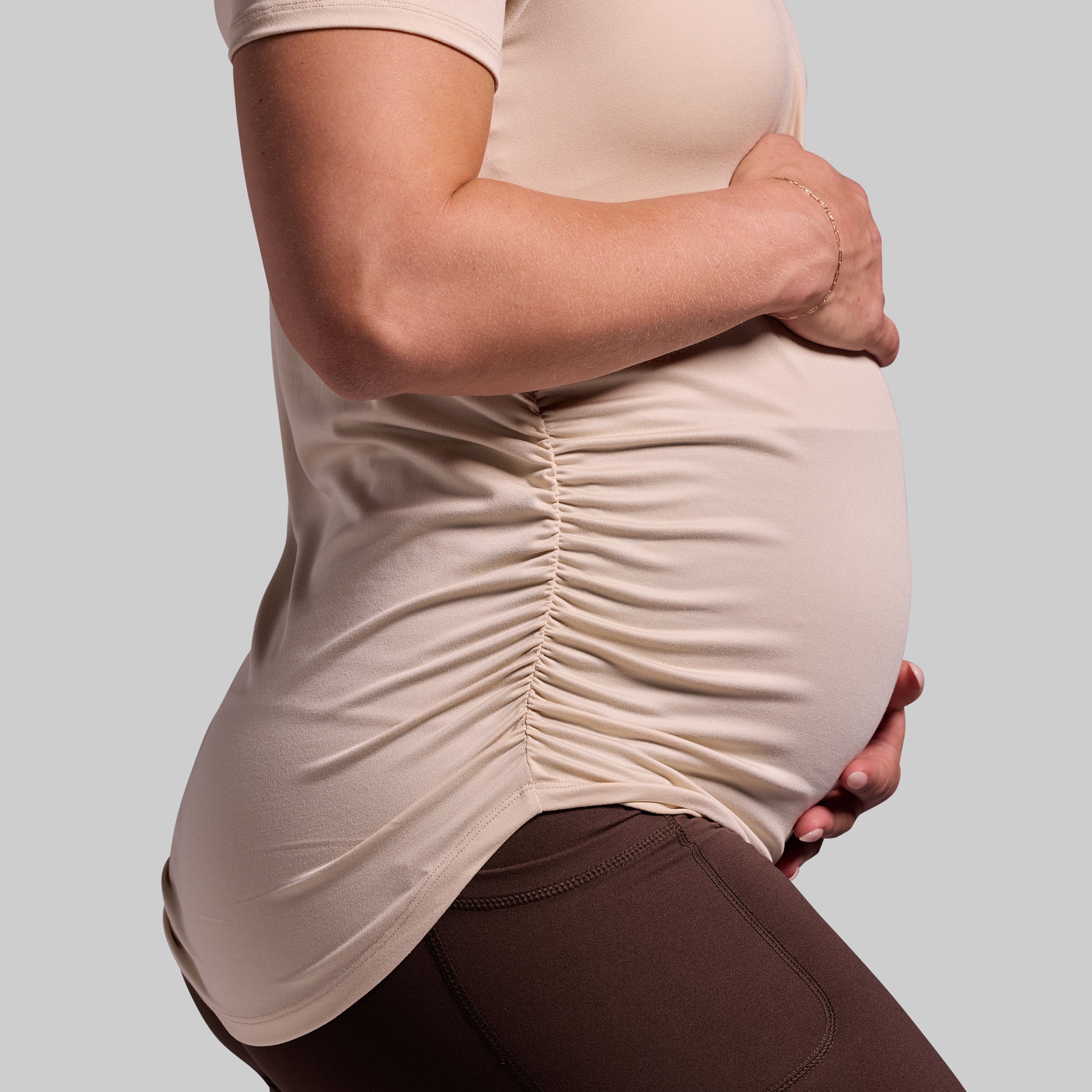 - Ruched sides provide additional room for your growing belly