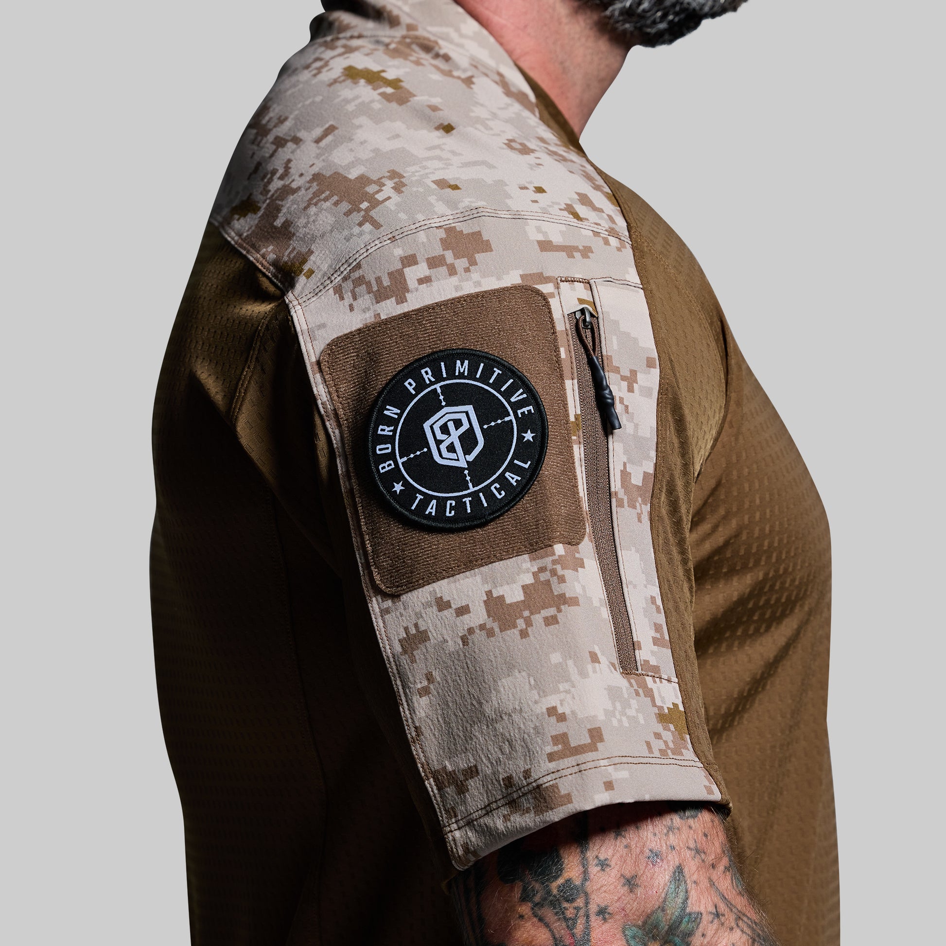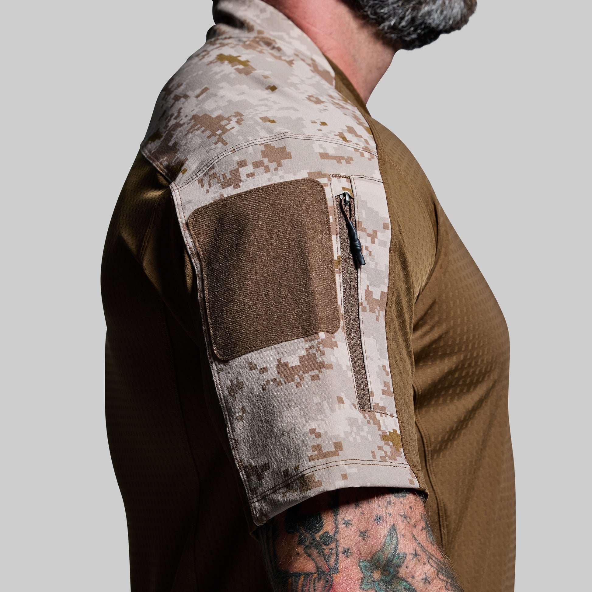 - Side zippered arm pockets w/ loop velcro patch and