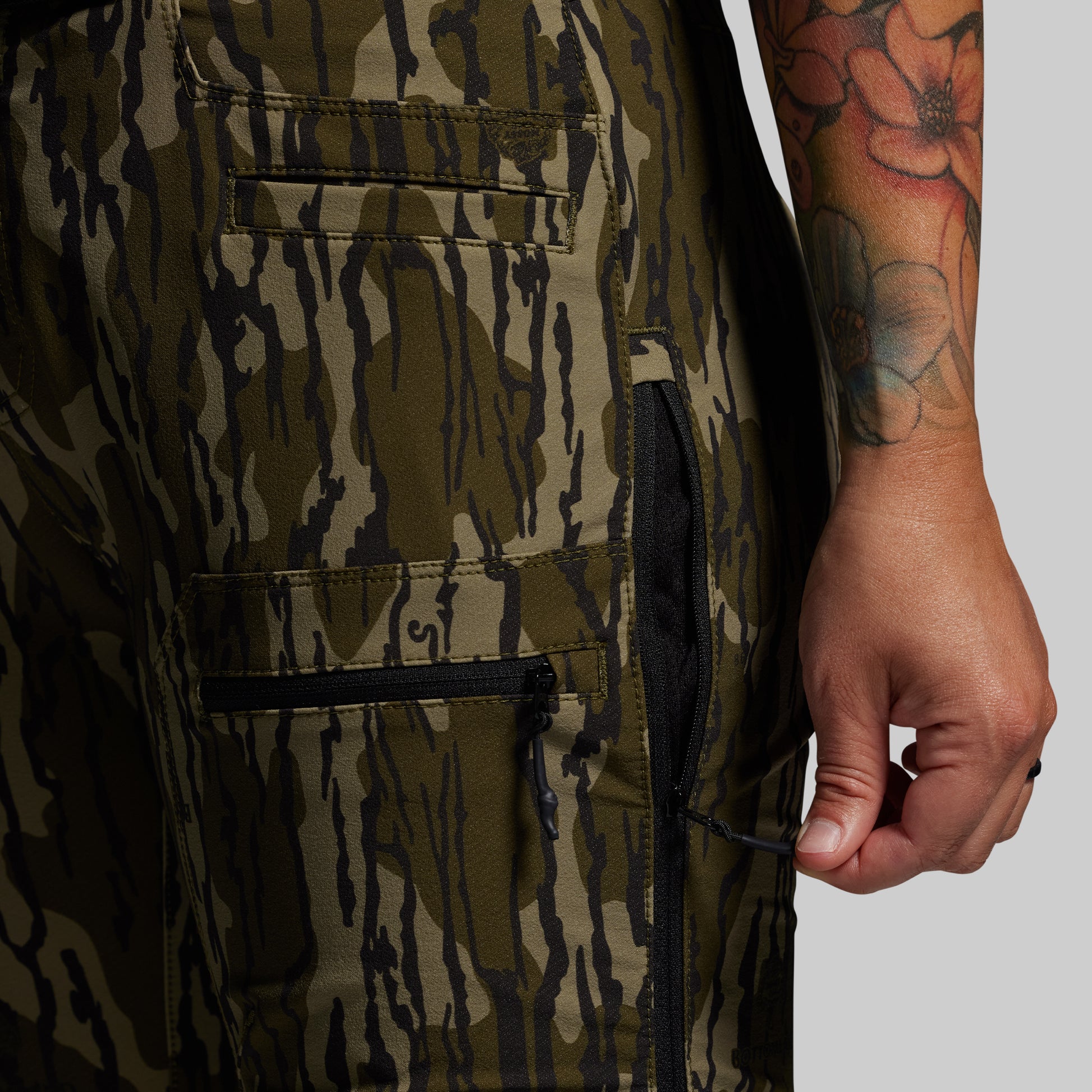 Pocket Configuration: Large front pockets (2). Low profile, front-facing cargo pockets (2) with quiet-close zipper (L). Front welt pockets (2), rear welt pockets (2) with quiet-close zipper (R).